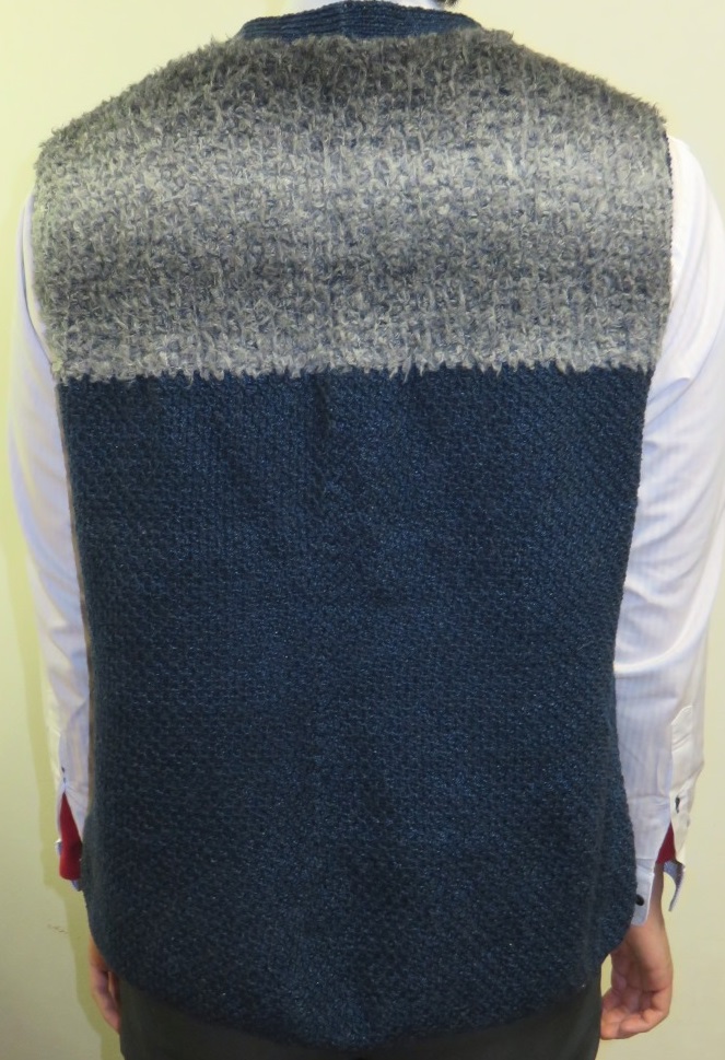 紺色の部分がかのこ、グレーの部分がプレーンアフガン編みとなっています。メンズベストとしてデザインし、編みました。
