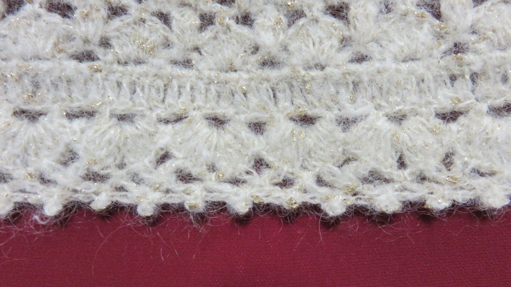 かぎ針編みの課題作品です。乳白色のモヘアに金のネップが煌めきます。