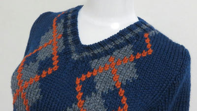 模様は伝統的なアーガイル模様。縦糸渡しでグレーのダイヤを編み、その上から朱の糸でメリヤス刺繍を行いました。