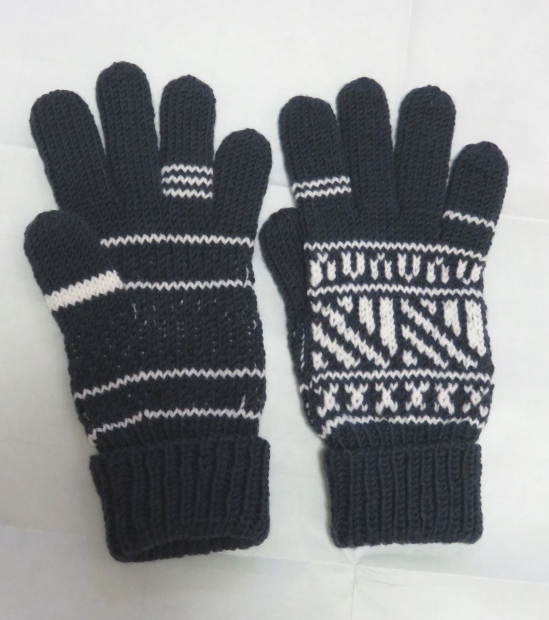 棒針編みの課題作品。メンズサイズの5本指手袋です。季節は考えないものとします。