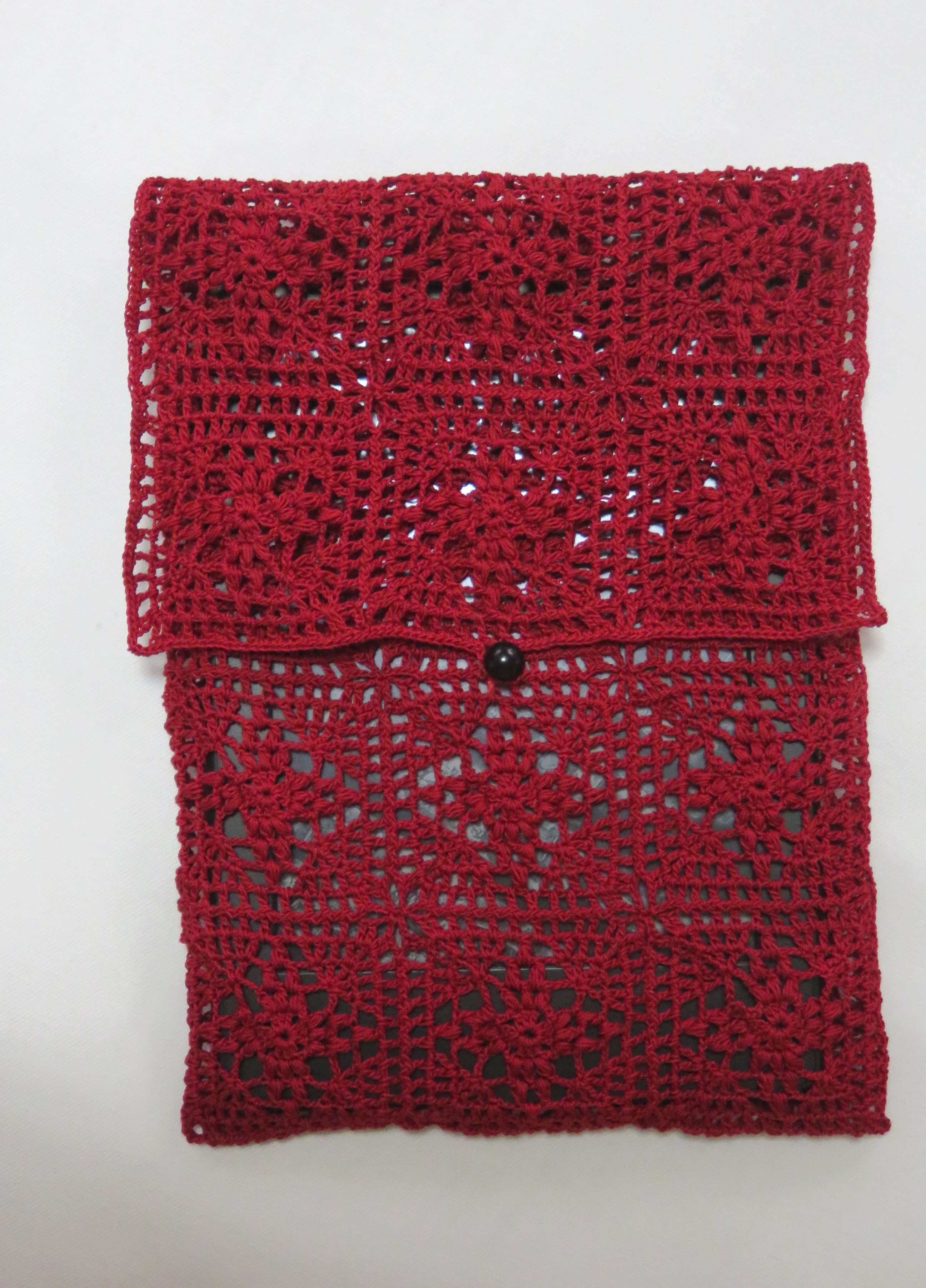 モチーフを本体に当てながらぶっつけ本番で編み進めたところ、モチーフ数4×3のサイズで本体の面にジャストフィット。計30個のモチーフでKindleに合うポーチの形となりました。