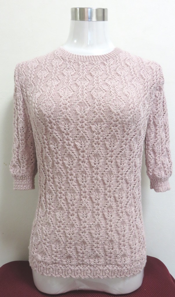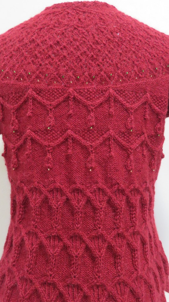 身頃には裏目を基本とした立体的な模様を、ヨーク部分には透かし模様を組み入れ、それぞれの一部にガラスビーズを編みつけてあります。